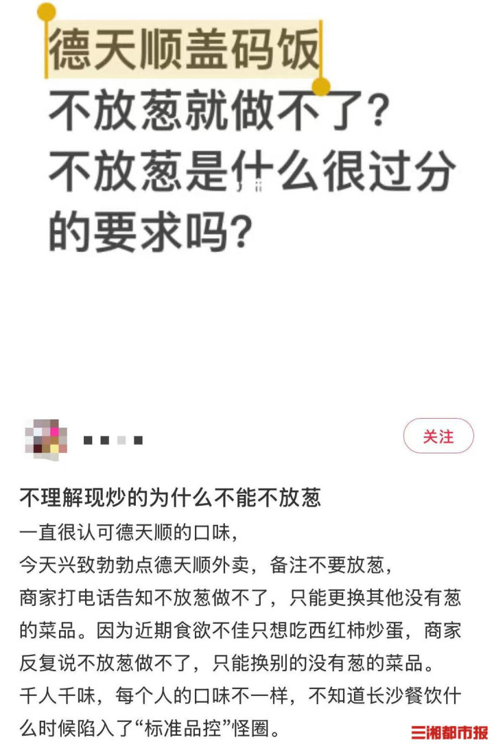 俗话说,众口难调。近日,一湖南网友在社交媒体发帖表示,在下单德天顺外卖时,备注“不要葱”,却被商家回复“做不了,只能更换其他没有葱的菜品”。该网友认为,商家在制作时不放葱并不麻烦,并不认同商家以“标准品控”理由拒绝自己的要求。